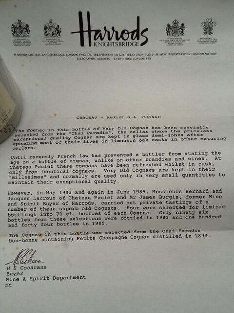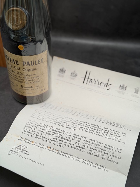Collector’s Presentation: The bottle is housed in its original branded wooden presentation case and is accompanied by the original Harrods descriptive letter—a critical component for maintaining its investment-grade value.