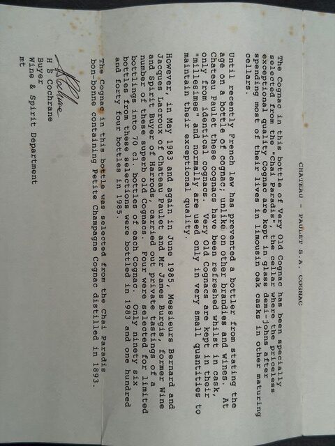Acquire a rare liquid relic of the late Victorian era with this authenticated 1893 Château Paulet Petite Champagne Cognac. Distilled over 130 years ago, this spirit was hand-selected from the prestigious “Chai Paradis”—the estate’s most exclusive cellar where priceless eaux-de-vie are kept in glass demi-johns after aging for decades in Limousin oak.