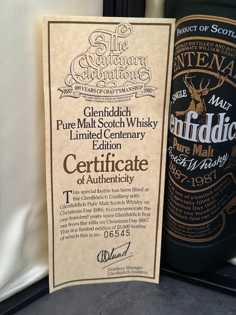 Bottled on Christmas Day 1986 to celebrate 100 years of the Glenfiddich distillery, this is a very rare limited bottling of which only 12,000 bottles were released. This is bottle number 6545.