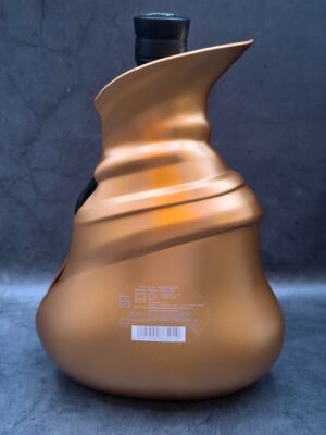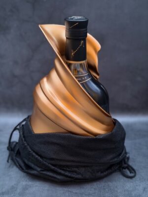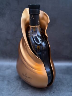 The design features a specially molded aluminum “second skin” that wraps around the classic Hennessy X.O shape. It is designed to mimic the draping of couture fabric, twisting and folding around the glass. This is the “Ready-to-Wear” version of the collaboration (there was also an ultra-limited titanium “Masterpiece” version that sold for £25,000!).