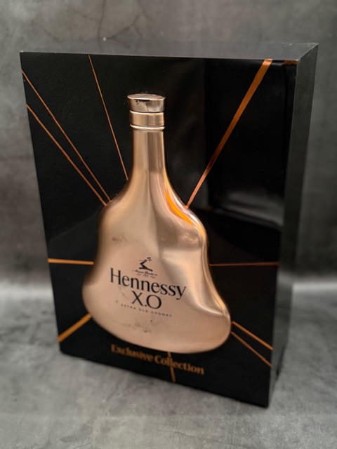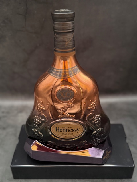 Levy, known for his “Rock” sculptures, reimagined the classic Hennessy X.O decanter with a highly reflective, metallic copper/gold finish. This choice of material pays homage to the copper pot stills used to distill the eaux-de-vie. The presentation box features a dynamic geometric “ray” pattern, symbolizing the radiating power of the cognac inside.