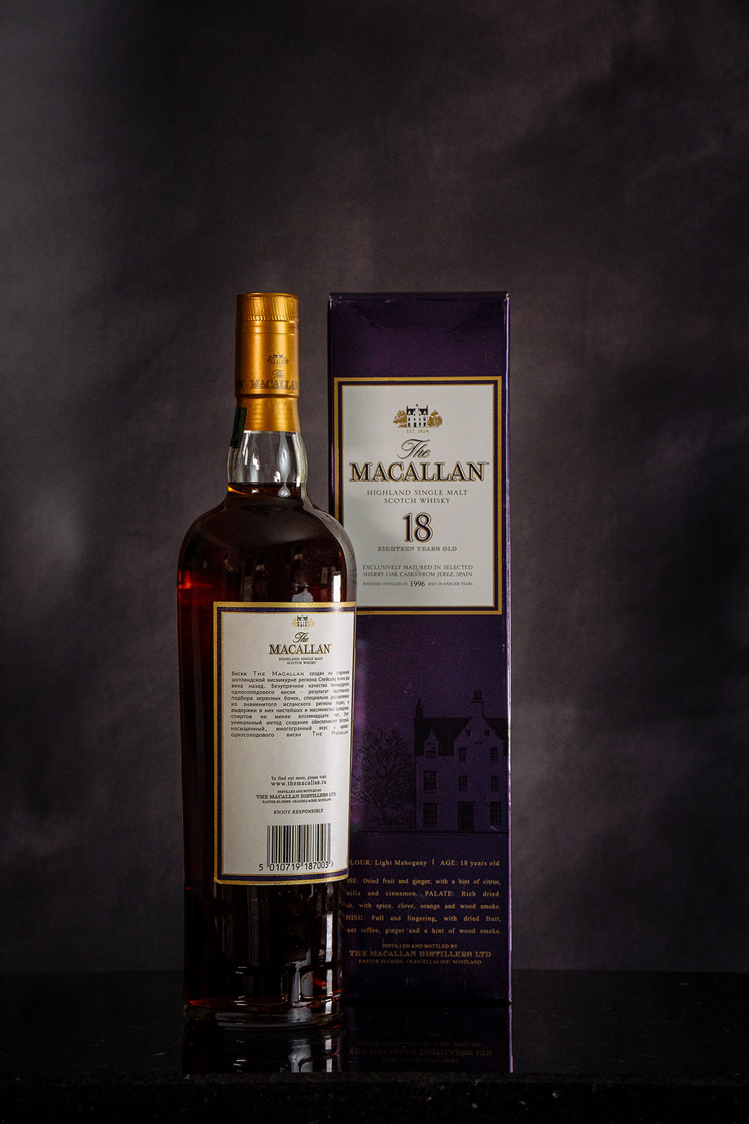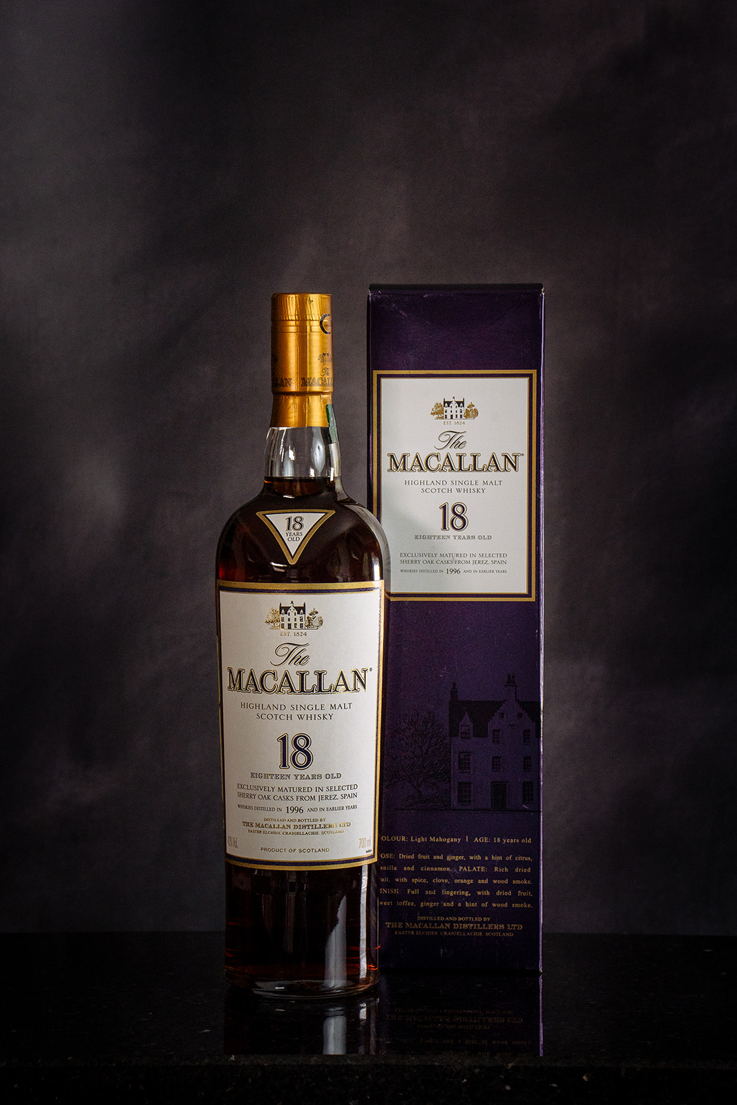 The 1996 vintage Macallan is a complex cohesion of dried fruits, ginger, orange peel and leathery sherry. The latter influence is no surprise, after all, since the nectar matured exclusively in sherry casks from Jerez. An easy-drinking whisky that errs on the side of luxurious.
