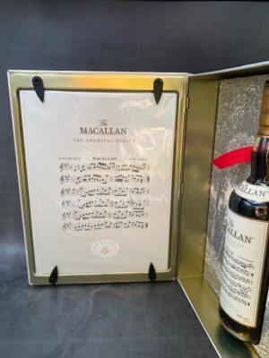Own the highly collectible Macallan Folio 4, the fourth release in the coveted Archival Series. Released in 2019 via a highly sought-after ballot, this edition is famously known as the “Music for the Mouth” bottling. The iconic book-shaped presentation tin celebrates the legendary advertisement featuring a Strathspey composed by James Scott Skinner (“The Strathspey King”)—a groundbreaking ad that included the first musical notation ever in a British newspaper. This exquisite single malt Scotch whisky is bottled at 43% ABV, representing an essential piece of Macallan memorabilia and a superb investment opportunity.
